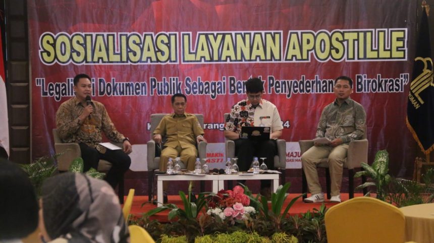 Kemenkumham Banten dalam sosialisasi Layanan Apostille mengundang empat narasumber untuk memberikan informasi mengenai apostille kepada masyarakat yang hadir meliputi notaris, akademisi, mahasiswa dan pelajar, serta dinas-dinas terkait, Senin (27/05/2024).