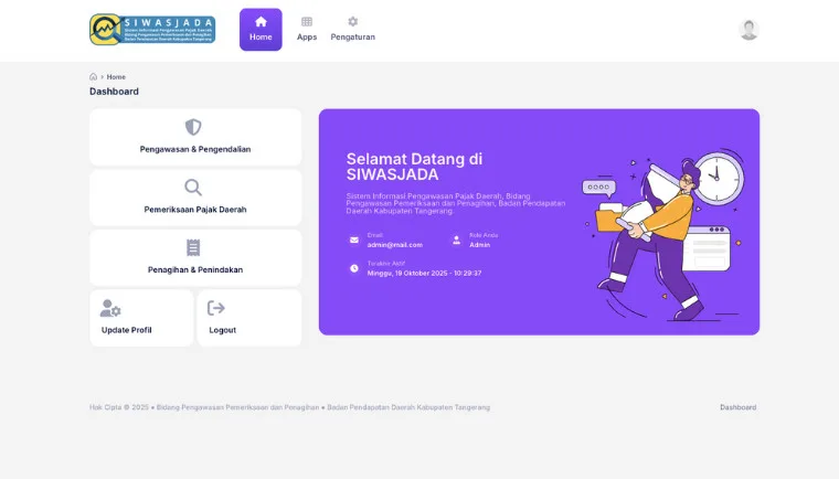 Melalui pengembangan ini, Bapenda Kabupaten Tangerang berharap Siwasjada 2.0 dapat menjadi instrumen digital yang mendorong transparansi, efisiensi, dan akuntabilitas dalam pengelolaan pajak daerah. Sistem ini juga diharapkan dapat membantu meningkatkan penerimaan pajak serta memperkuat kepercayaan publik terhadap layanan Bapenda.