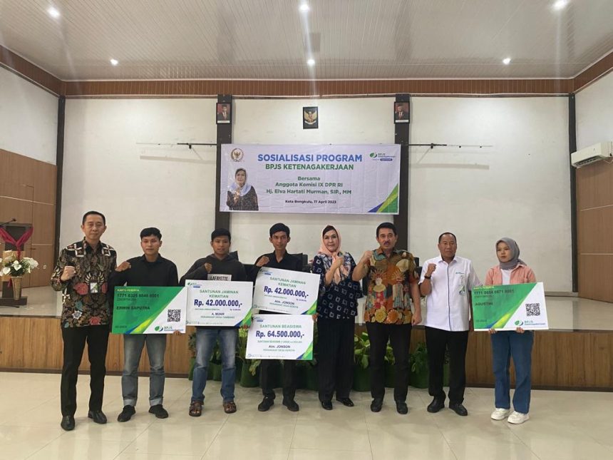 Bengkulu, Gitamedia.com – Badan Penyelenggara Jaminan Sosial Ketenagakerjaan (BPJAMSOSTEK) cabang Bengkulu bersama anggota Komisi IX Dewan Perwakilan Rakyat Republik Indonesia (DPR-RI) , Hj. Elva Hartati menyelenggarakan sosialisasi manfaat program BPJS Ketenagakerjaan kepada 300 Pekerja Bukan Penerima Upah (BPU), Senin (17/4).