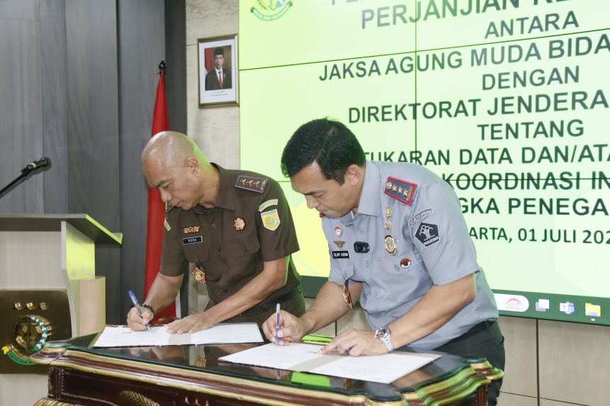 JAKARTA, Gitamedia.com – Direktur Jenderal Imigrasi, Silmy Karim menandatangani Perjanjian Kerja Sama(PKS) dengan Jaksa Agung Muda Intelijen Kejaksaan RI, Reda Manthovani pada Senin, 1 Juli2024 bertempat di Gedung Utama Kejaksaan Agung RI, Jakarta. Kerjasama ini bertujuan untuk memperkuat pertukaran data dan informasi serta koordinasi intelijen dalam rangka penegakan hukum.
