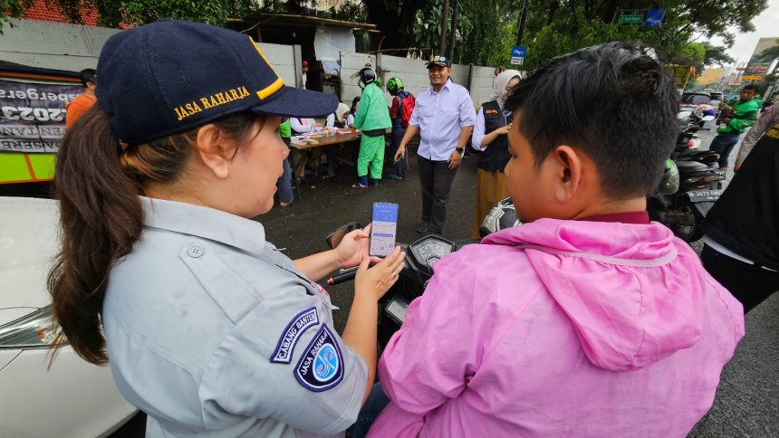 TANGERANG, Gitamedia.com – Petugas Jasa Raharja Perwakilan Tangerang Cabang Banten, Samsat Cikokol Cinthya Rouwena melakukan giat pendekatan serta sosialisasi aplikasi SIGNAL kepada para pengendara kendaraan bermotor di sekitar wilayah Jalan Daan Mogot, Tangerang.