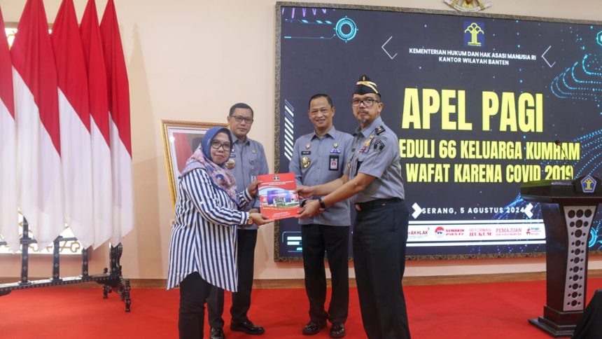 Santunan kepada 66 (enam puluh enam) keluarga ini secara simbolis diberikan kepada ibu Darsilawati selaku istri dari Agus Rochadi yang meninggal karena covid tahun 2021 pada pelaksanaan apel pagi di Lingkungan Kantor Wilayah Kemenkumham Banten.