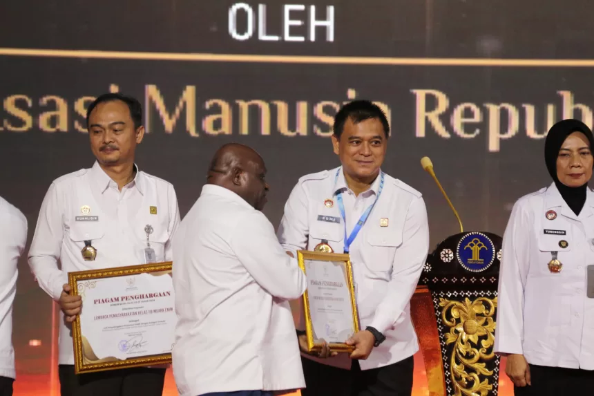 Penghargaan diberikan oleh Menteri Hak Asasi Manusia Natalius Pigai saat refleksi akhir tahun Kemenkumham, Senin (16/12/2024).