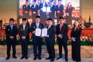Kota Tangerang Selatan, (gitamedia.com) Pemerintah Kota Tangerang Selatan bersama dengan DPRD Kota Tangerang Selatan melakukan tanda tangan bersama persetujuan revisi undang-undang terkait dengan Pajak Daerah dan Retribusi Daerah pada sidang paripurna di Gedung DPRD Serpong, Kota Tangerang Selatan, Banten.