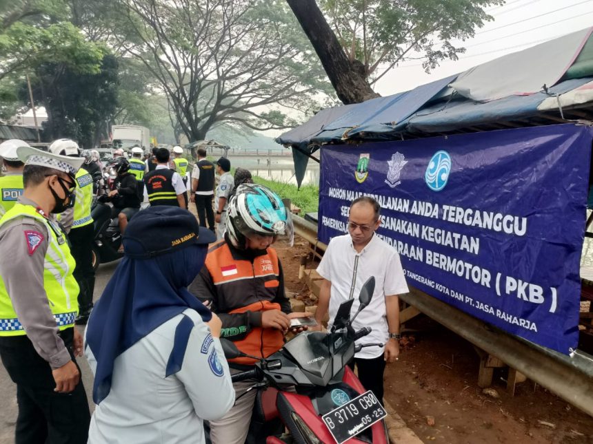 Kepala UPT PPD SAMSAT Cikokol Dwi Nopriadi menjelaskan kepada pengendara yang kedapatan belum melakukan pelunasan PKB & SWDKLLJ agar di data dan diberikan himbauan.