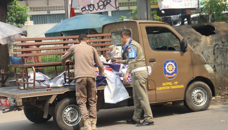 Satpol PP menurunkan APK yang dipasang tanpa izin di luar zona yang telah ditentukan. Operasi penertiban ini melibatkan puluhan personel yang disebar di berbagai titik di sekitar Puspemkab Tangerang. APK yang telah ditertibkan kemudian diamankan untuk dijadikan barang bukti.