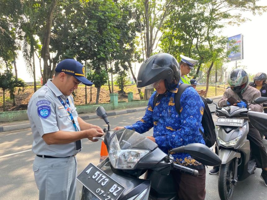 SERANG, Gitamedia.com – Senin, 17 Juli 2023 Petugas Jasa Raharja Cabang Banten, Badan Pendapatan Provinsi Banten dan Polda Banten melaksanakan kegiatan Razia Pajak Kendaraan Bermotor yang bertempat di Patung Jalan Akses Tol Serang Timur, Panancangan, Kec. Cipocok Jaya, Kota Serang, Banten.